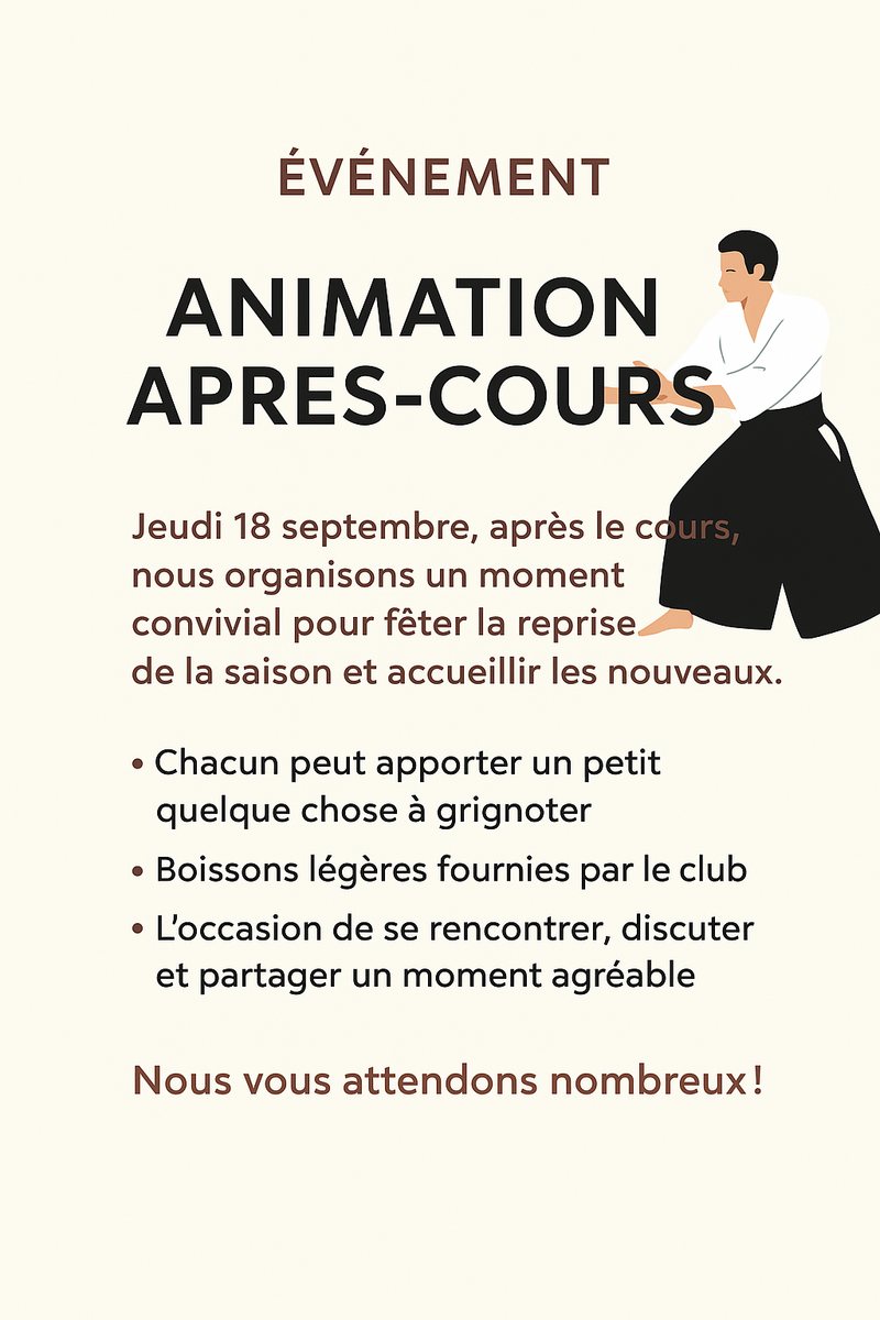 Pour fêter la reprise de la saison et accueillir les nouveaux adhérents, le club organise un petit moment convivial après le cours du jeudi 18 septembre :