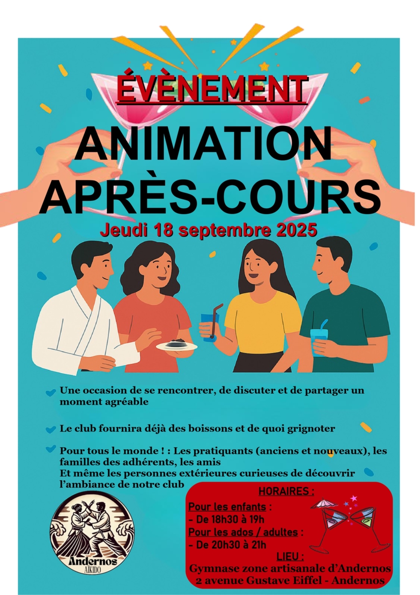 Demain, le club Aïkido Andernos organise un moment convivial après le cours enfants et le cours adulte pour fêter la reprise de la saison et accueillir comme il se doit les nouveaux arrivants.