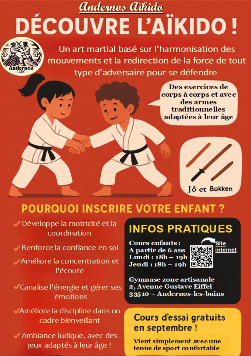 Vous cherchez une activité qui allie sport, respect et plaisir pour votre enfant ? L’Aïkido est un art martial japonais sans compétition : on y apprend à utiliser la force et le mouvement de l’autre plutôt que de s’y opposer. À travers des exercices ludiques, les enfants découvrent le respect, l’équilibre et le travail en coopération.