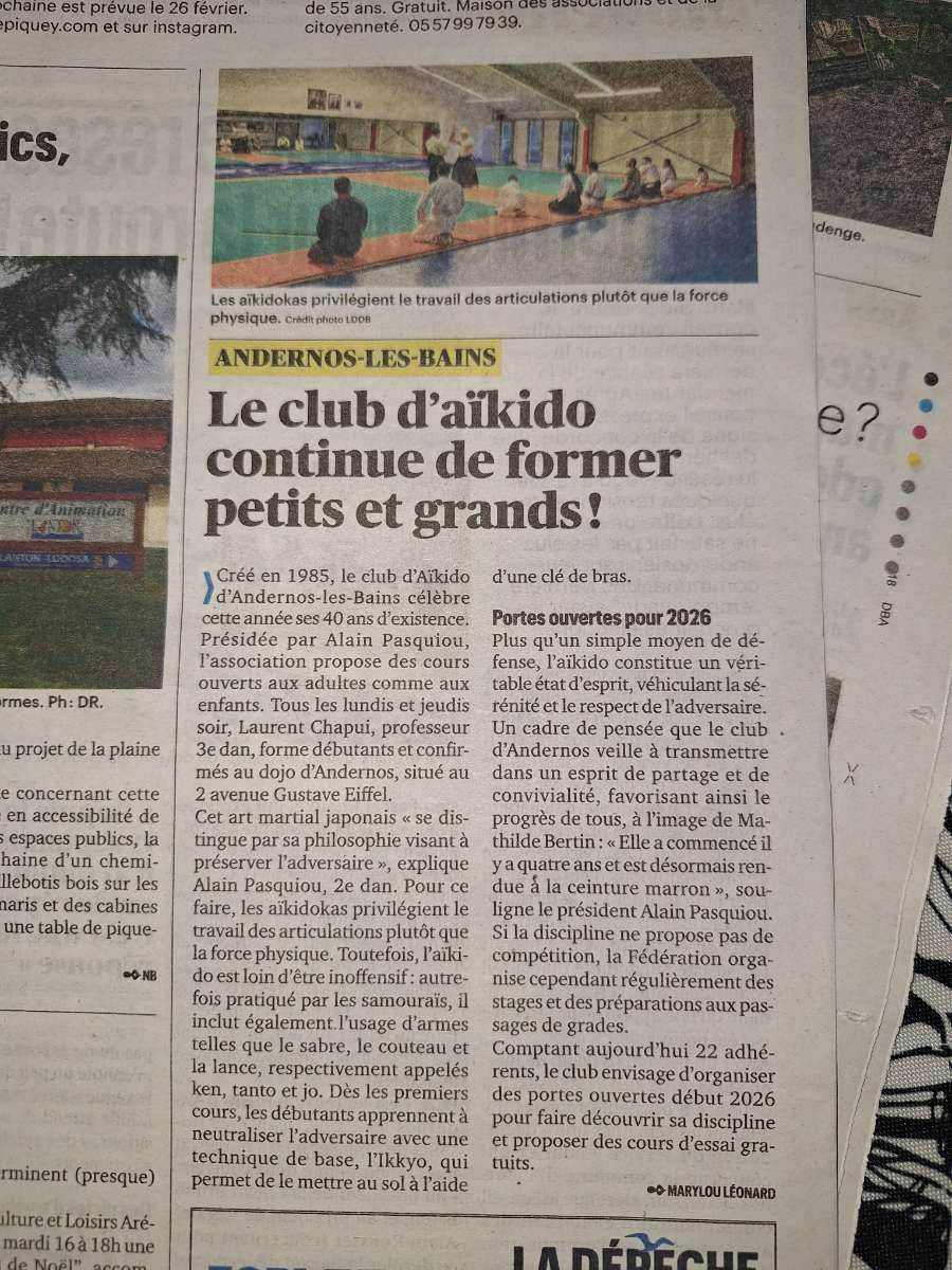 On parle de nous dans La Dépêche du Bassin ! Notre club d’aïkido à Andernos-les-bains a eu le plaisir de faire l’objet d’un article dans La Dépêche du Bassin, qui met à l’honneur notre discipline et ses valeurs : respect, maîtrise de soi, harmonie et partage.